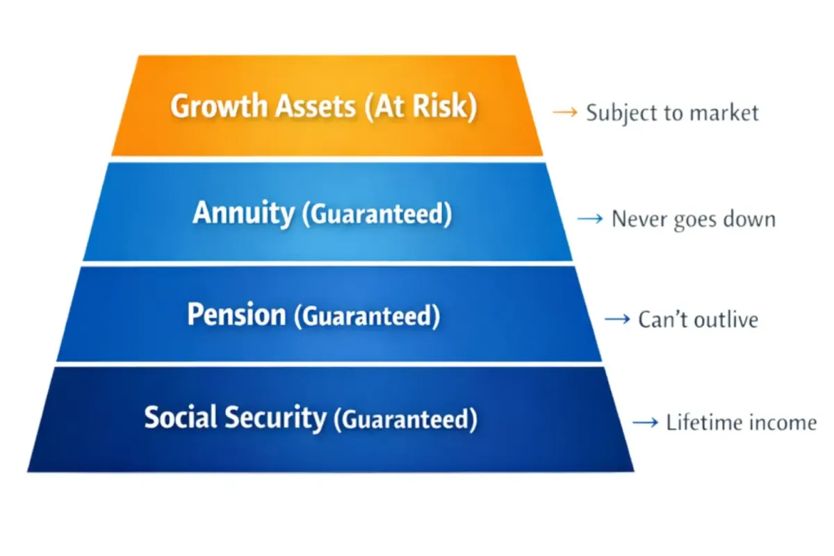 Layer 1 - Essentials: Build the foundation first and guarantee your lifestyle. Using social security, pensions, and annuities to cover essentials—food, housing, utilities.